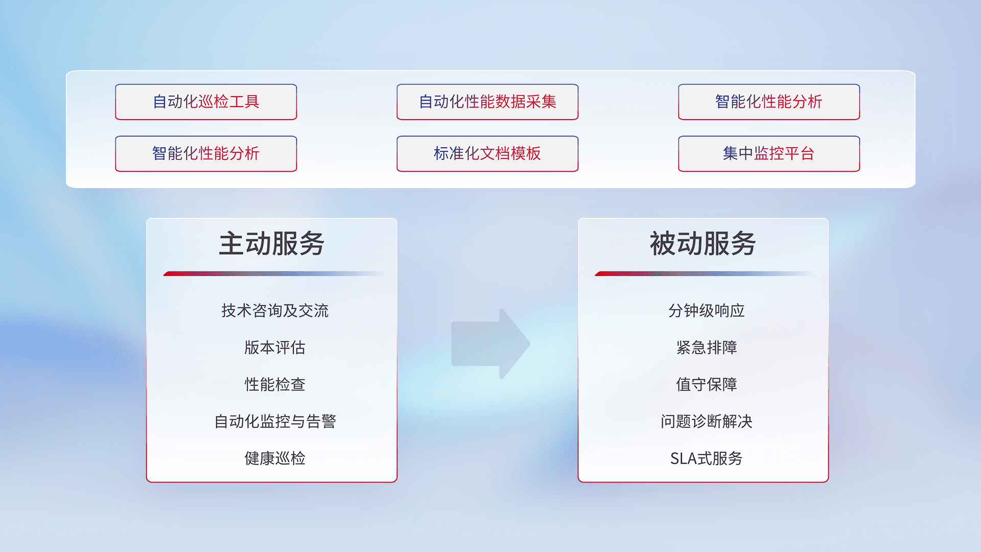 智能化工具和标准化文档,,,保障服务质量,,,提供主动服务(包含技术咨询、、、、版本评估、、、、性能检查、、自动化监控与告警、、、、健康巡检)和被动服务包含(分钟级响应、、、、紧急排障、、、值守保障、、、问题诊断解决、、SLA服务)。。。